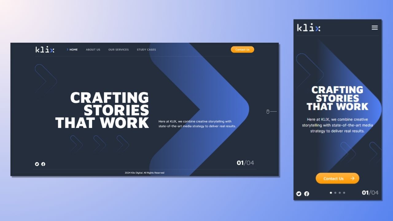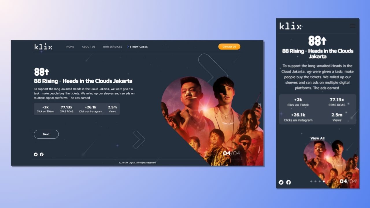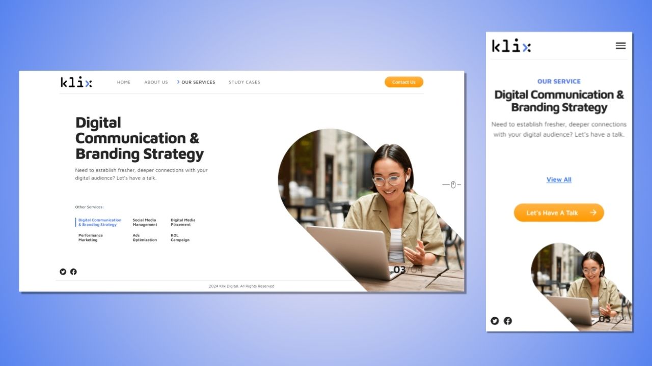 This website show information about company profile, services, and portfolio from Klix Digital.