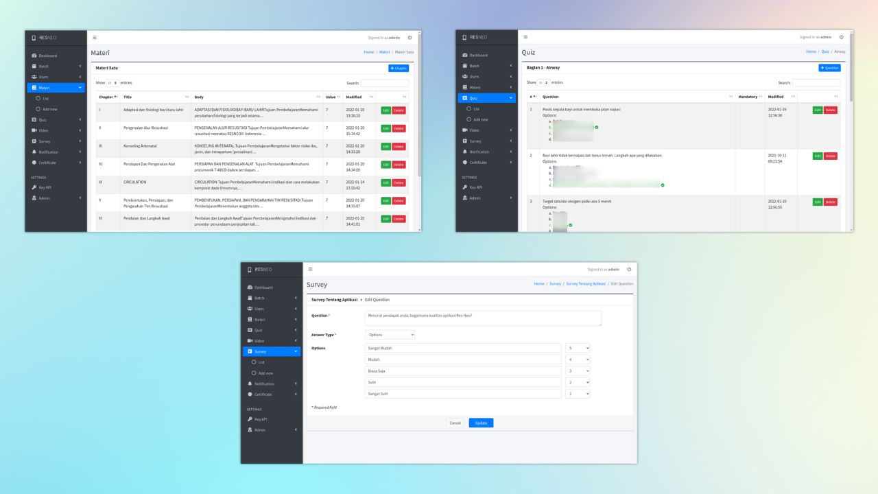 The ResNeo e-Learning application is a neonatal resuscitation training application developed by RSCM and NNI to support hybrid neonatal resuscitation learning with the Indonesian Pediatrician Association for Indonesian health workers.